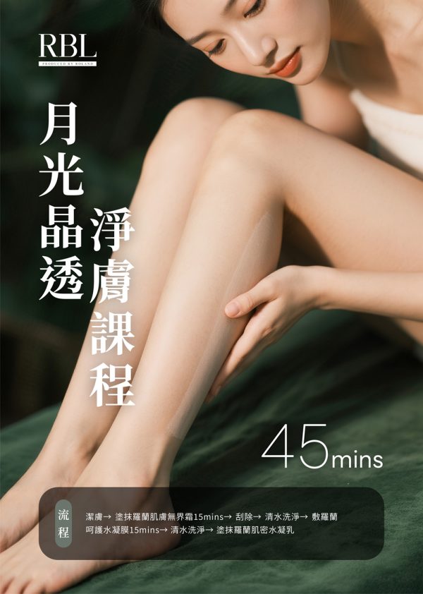 潔膚 → 塗抹羅蘭肌膚無界霜15mins → 刮除 → 清水洗淨 → 敷羅蘭呵護水凝膜15mins → 清水洗淨 → 塗抹羅蘭肌密水凝乳